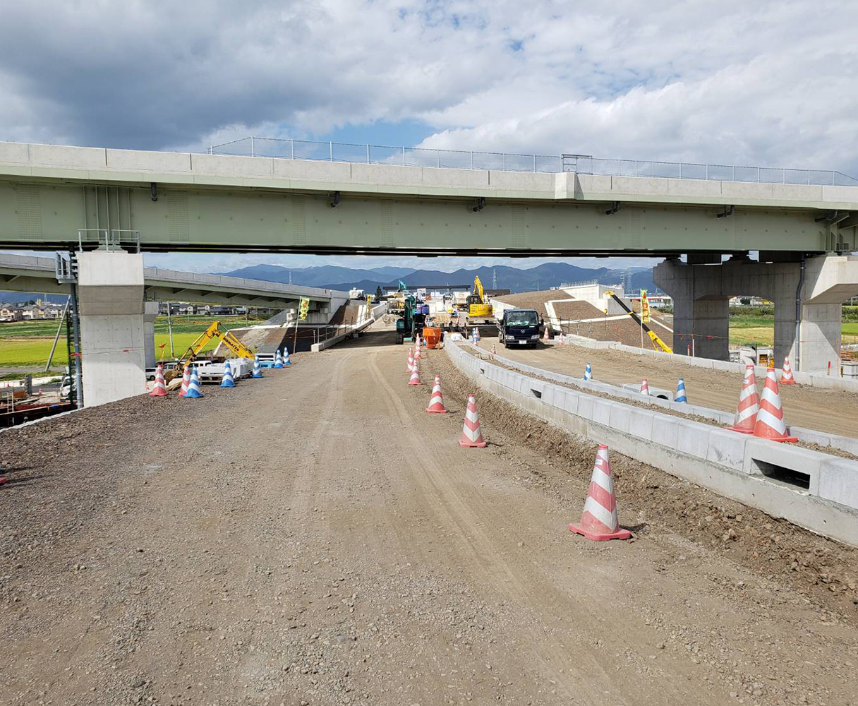 現在は、一般道路や高速道路、側溝など道路工事の設計・施工管理・施工業務など県内の公共工事を中心に対応しています。